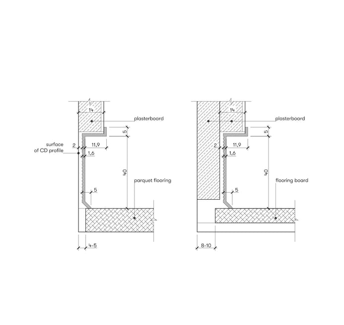 El P-1-40 es un rodapié de aluminio empotrado diseñado para crear una junta de sombra nítida y lograr el efecto de “pared flotante”. Se instala a ras de la superficie acabada de la pared, garantizando una geometría precisa en todo el perímetro y formando una línea de sombra limpia a nivel del suelo. Gracias a la instalación oculta, el interior queda libre de elementos salientes, gana ligereza visual y un aspecto moderno y minimalista. Este rodapié de aluminio es una solución fiable y funcional para proyectos minimalistas en apartamentos, viviendas privadas y espacios de oficina.