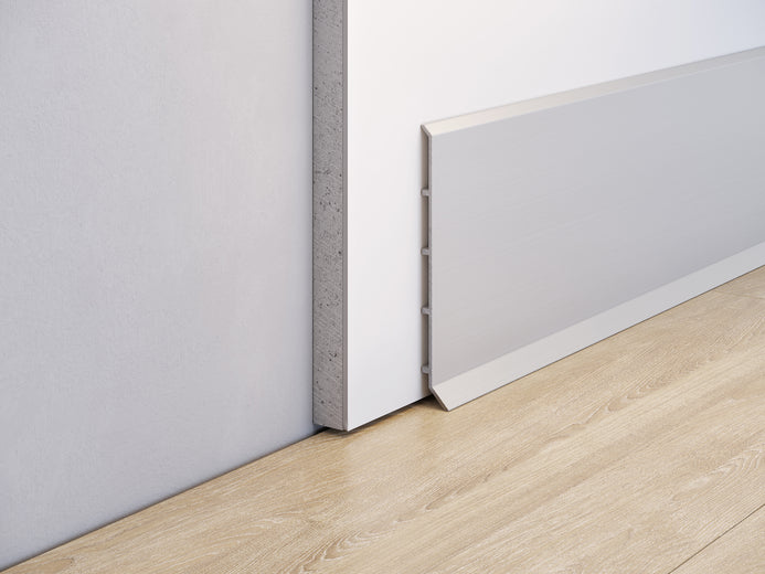 De geometrie van het profiel biedt niet alleen betrouwbaarheid maar ook een uitzonderlijk eenvoudige montage. Dit voorkomt dat de plint afwijkt van het wandoppervlak. Montagemethode – lijm. Het magazijnprogramma omvat productie met geanodiseerde coating (zilverkleurig). Poedercoating volgens RAL op aanvraag mogelijk. Hoogwaardige coating (15 micron anodisatie) biedt weerstand tegen vocht en huishoudelijke chemicaliën.